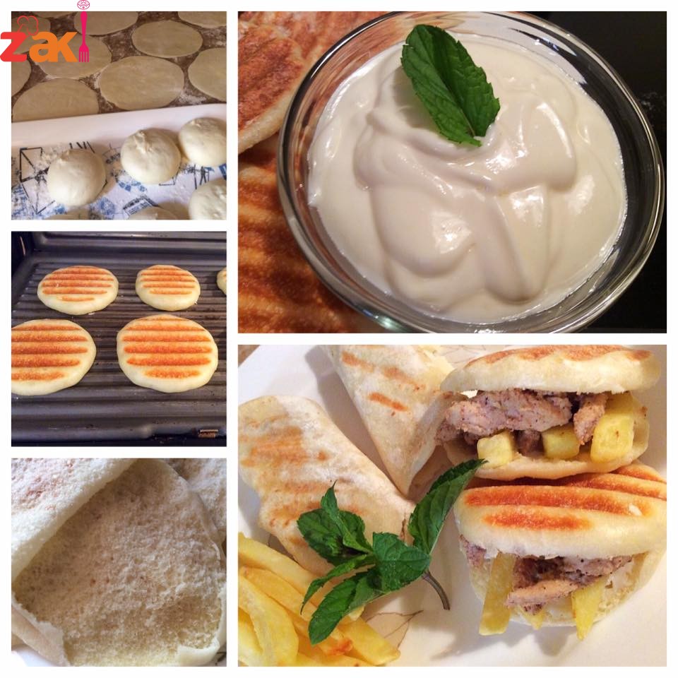 الخبز : ثلاث اكواب طحين ملعقه كبيره خميره ملعقه صغيره بيكينج بودر رشة ملح ملعقتين كبيره حليب بودره وملعقتين كبيره زيت وتخلط المواد كلها مع بعض ثم يضاف اليها كوبين ماء دافئ تقريبا ويسكب بالتدريج وتعجن لمده ٧ دقائق حتى تصبح ملساء وناعمه وتترك لتخمر ثم تقسم الى كور وترق وتترك لتخمر وتخبز بالشوايه ام على مقلى على الغاز عندما يبدأ الخبز يتغير لونه يقلب على الوجه الثاني حتى يرفخ او يرتفع.