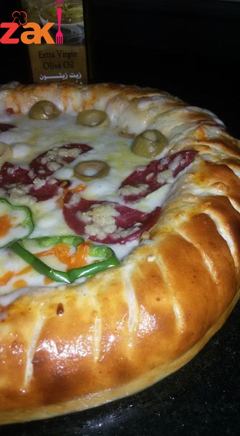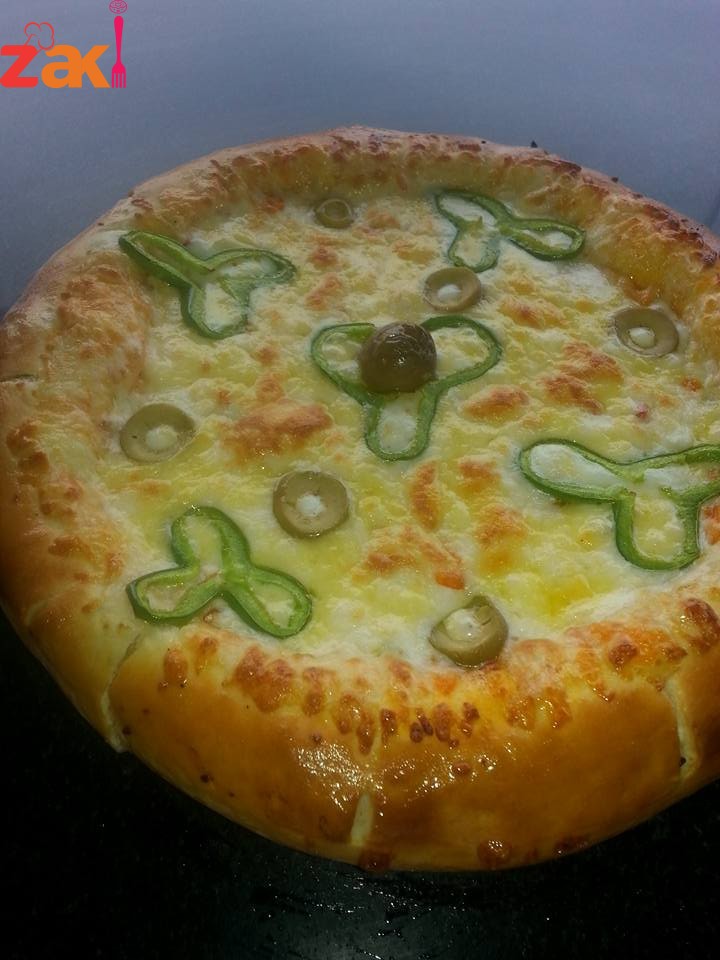ثم الموتزريلا ثم الشيدر مره أخرى ثم الخضار فلفل زيتون ثم ندخلها الفرن على درجة حراره ٢٥٠ درجه ونلحظ تحميرها وأخذها اللون الذهبى وبعد خروجها نرجو تلميعها بزيت الزيتون وبالهناء والشفاء …وارجو دعاكم
