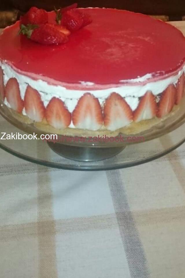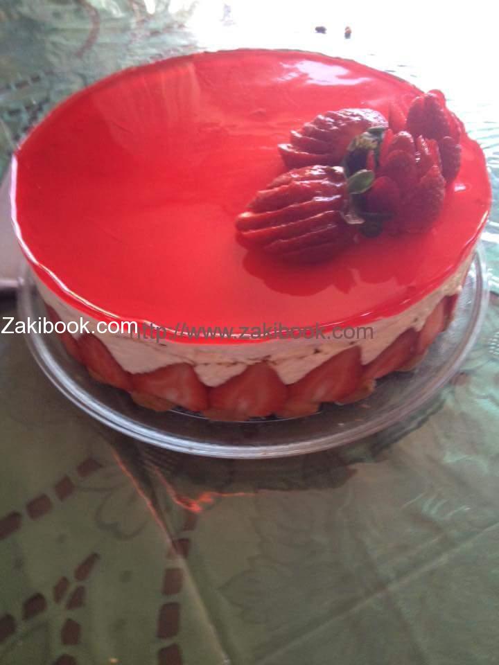 – ولما برد شوية ولكن يكون سائل نصبه على الوجه التورتة من الفوق ونلف نلف القالب علشان الجيلي يغطي كل التورتة من فوق ندخلها الثلاجة تبرد.
