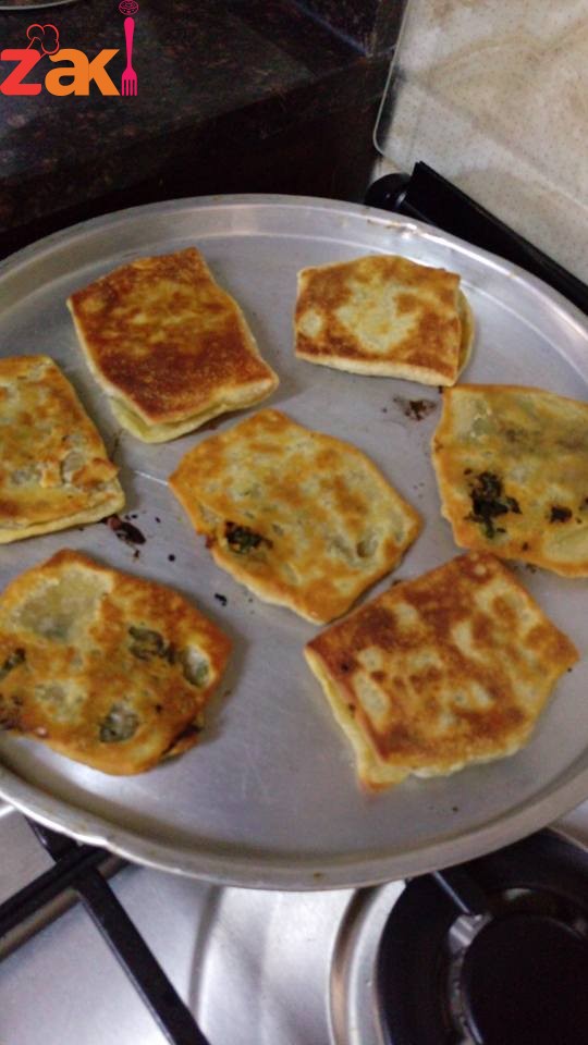 بعدين قطعت العجين كرات متوسطة ورقيتهم بمرقة العجين لحتى صارت العجينة شفافة دهنتها زيت ثنيت طرفين العجينة للوسط كما هو بالصورة حطيت معلقتين من حشوة السبانخ