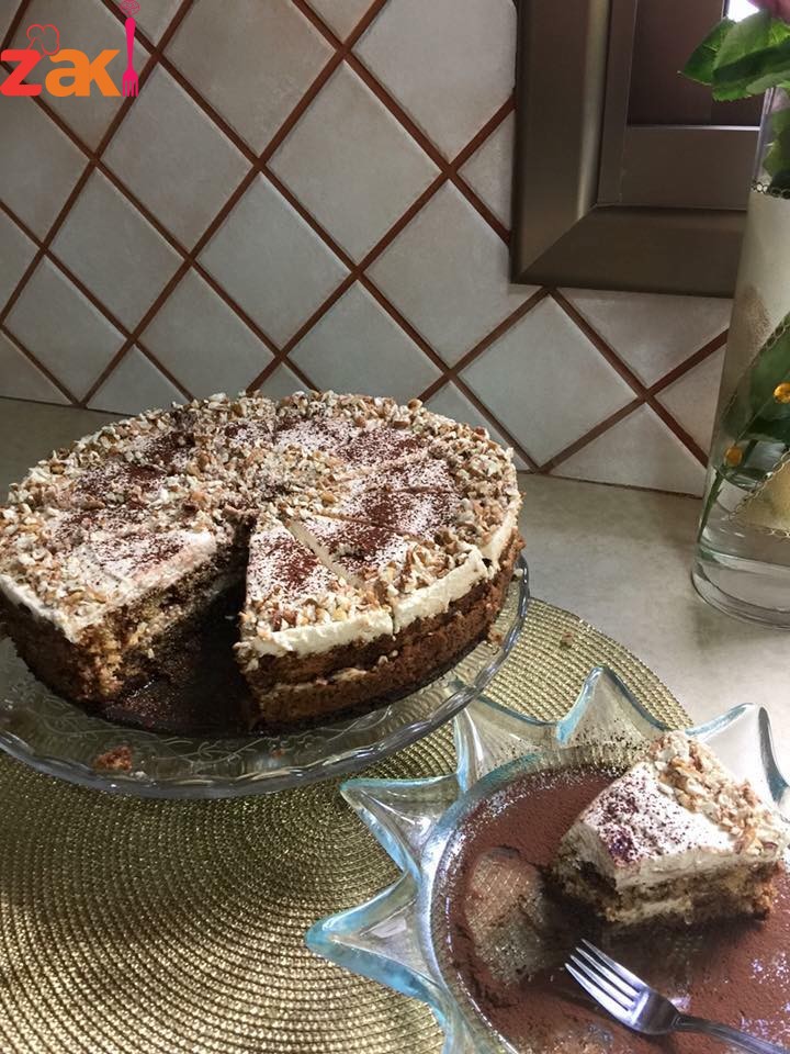 حلوة و1 بودنج فانيل و1 كاس حليب ومعلقة كبيرة نس كافيه حتى تصبح كريمه ونضعها فوق الكعكه ونزينها بالجوز المحمص