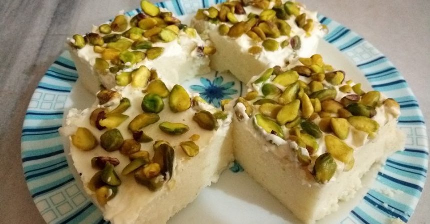 لتر حليب كاس سميد ظرف بيكنج باودر مستكة ملعقة ماء زهر ٣معالق سكر يوضع الخليط.ع الغاز ويحرك حتى يصبح سميك بعدها يوضع بصينية ويوضع فوق الخليط علبتين قشطة وفستق حلبي وتوضع بلثلاجة لمدة ٣ساعات وتصبح جاهزة للتقديم ويوضع فوقها القطر حسب الرغبة