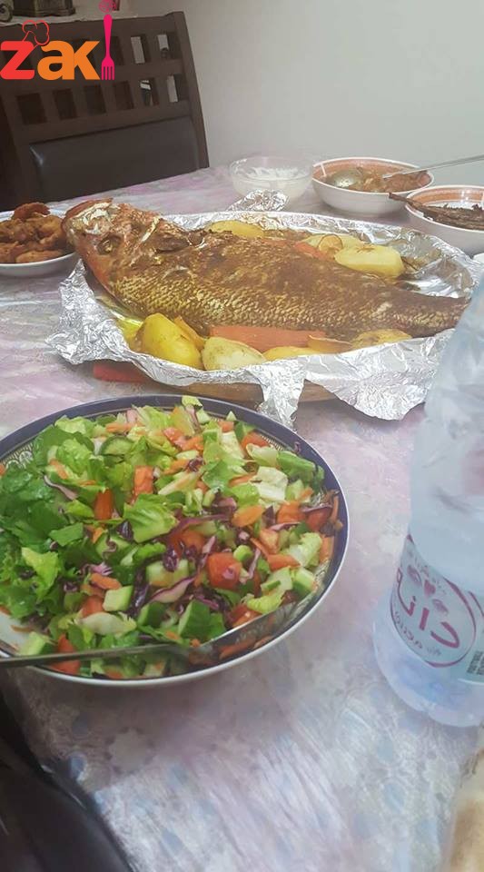 وبحطها بالفرن وبحط معها خضره مشكله وشرايح ليمون بتاخد بالفرن شي ساعه على حسب حجم السمكه وسويت جنب السمك قريدس مقلي بالبيض والبقساط وسلطه وصحتين وعافيه