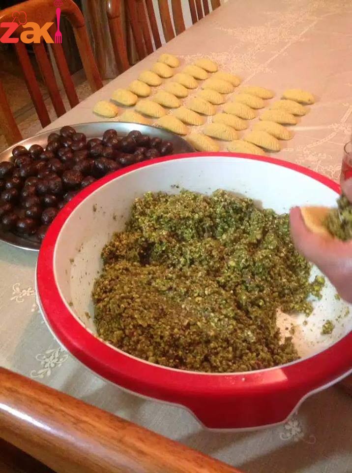 وفي الصباح يعجن باقي المواد ويقرص ويحشى بالتمر والفستق حلبي