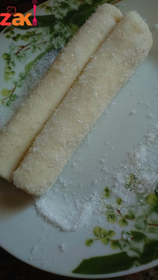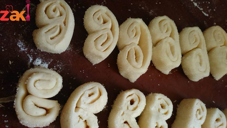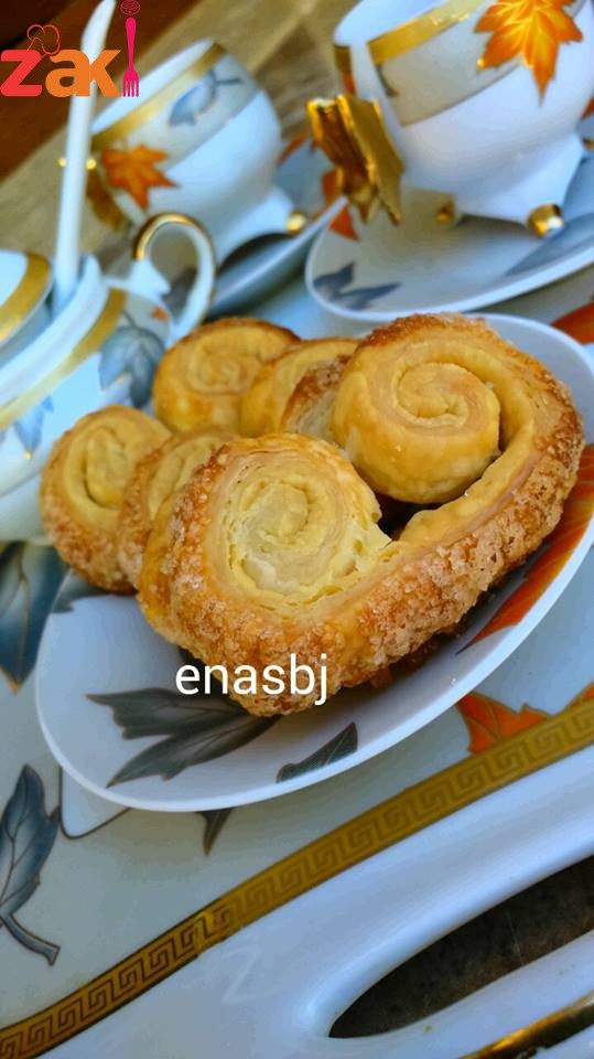 . تزال كمية الدقيق الزائدة ويدهن المستطيل بالزبدة ويرش جيداً بالسكر ثم يلف من الجهتين ويقطع شرائح متوسطة الحجم ترتب على ورق زبدة في طاجين وعالفرن. حرارة 180 وألف صحة وعوافي يقدم مع الشاي