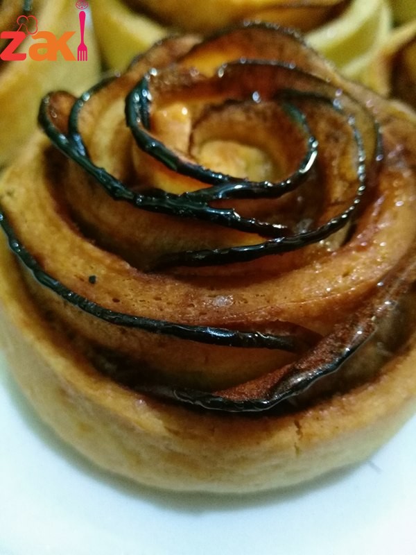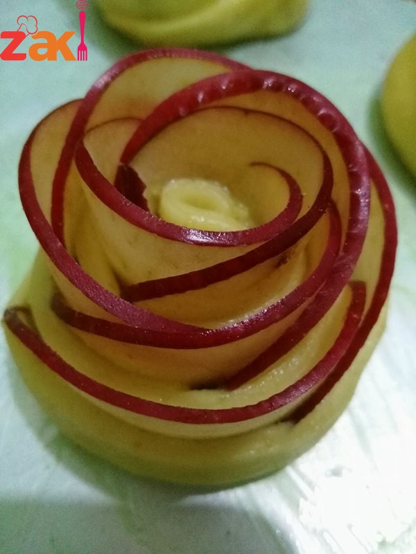 وبعدين نفرد العجينة وندهن سمن ونرش عليها قرفة مع سكر وشرائح تفاح ونلفها ونخبزها