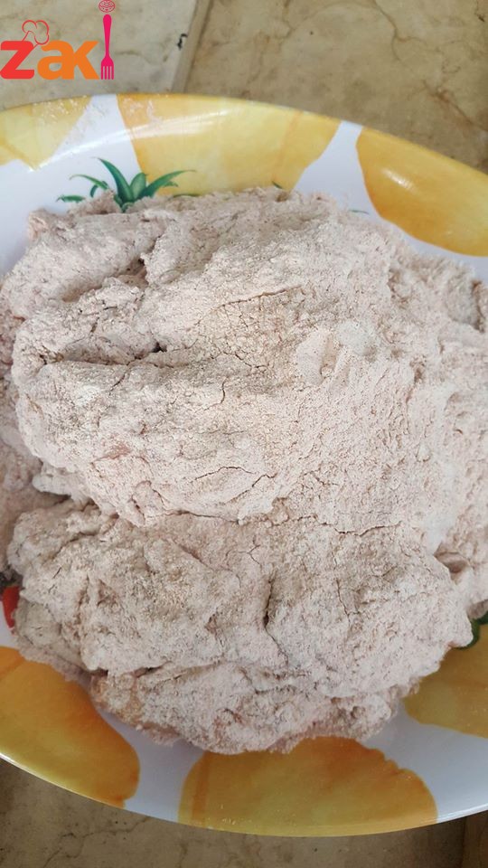 وبنغطس قطع الدجاج بالطحين وبنقليهم بزيت سخن على حرارة متوسطة