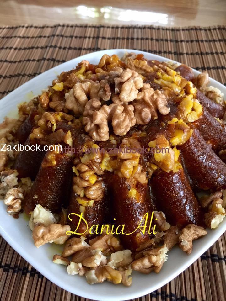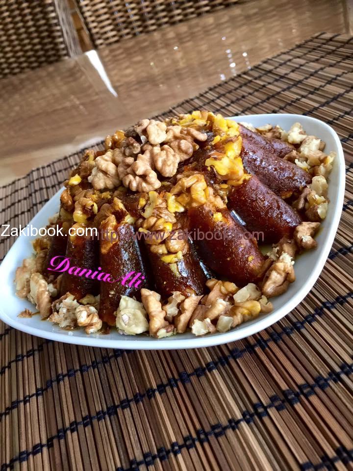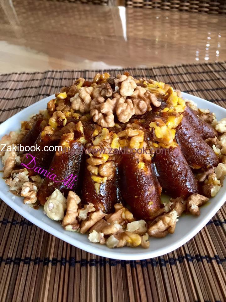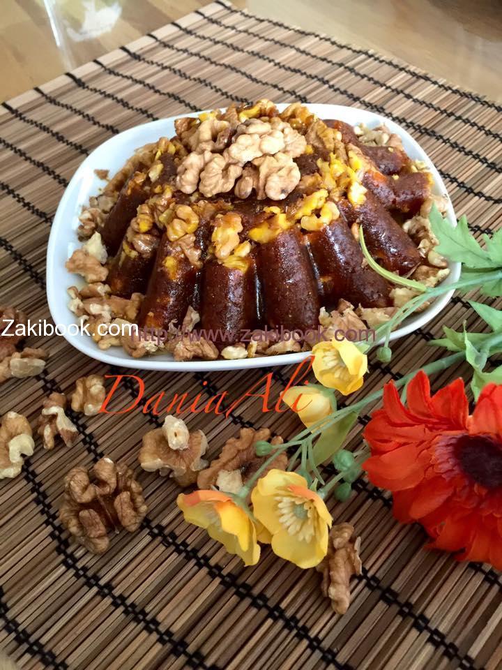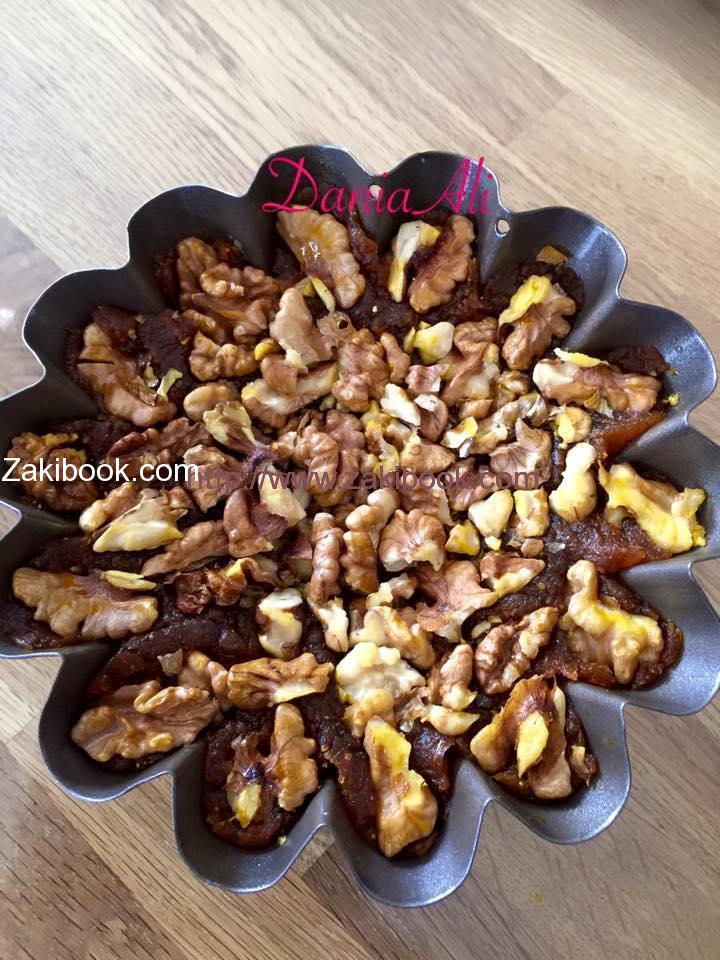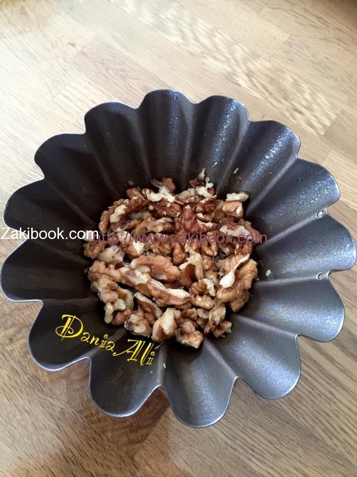 8 – ثم طبقة أخرى من الجوز ، ويترك إلى أن يبرد تماما ويقلب في طبق التقديم .
