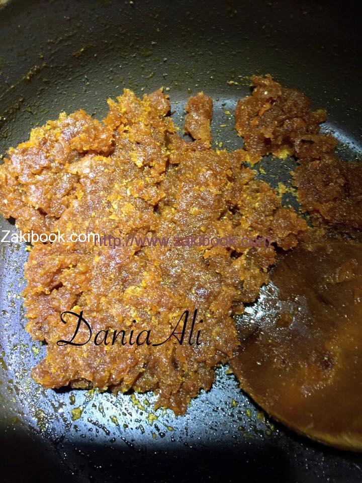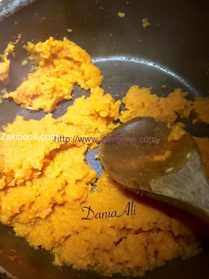 1 – يقشر الجزر ويبشر ناعما جداً ، ونضعه على النار مع نصف كوب ماء ، ونتركه يغلي إلى أن ينشف ماؤه .