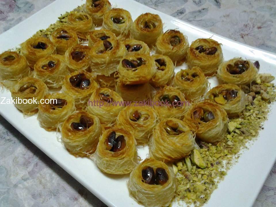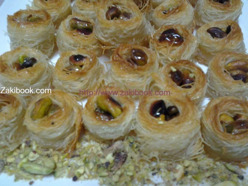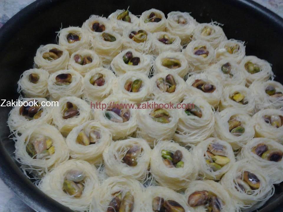 بتلفي خصله ع ايدك لتصير متل العش بتصفيهم بالصينيه وبتتركيهم نص ساعه لتنشف العجينه وتاخد الشكل بعدين بتحشيها فستق حلبي عليه م ص ماء زهر وبعد ما تحشيها بتشربيها زبدة مزبوط وعالفرن بس تتحمر من تحت بتحمريها من فوق وبتشربيها قطر وصحتين وهنا سهله وطيبه كتيييير