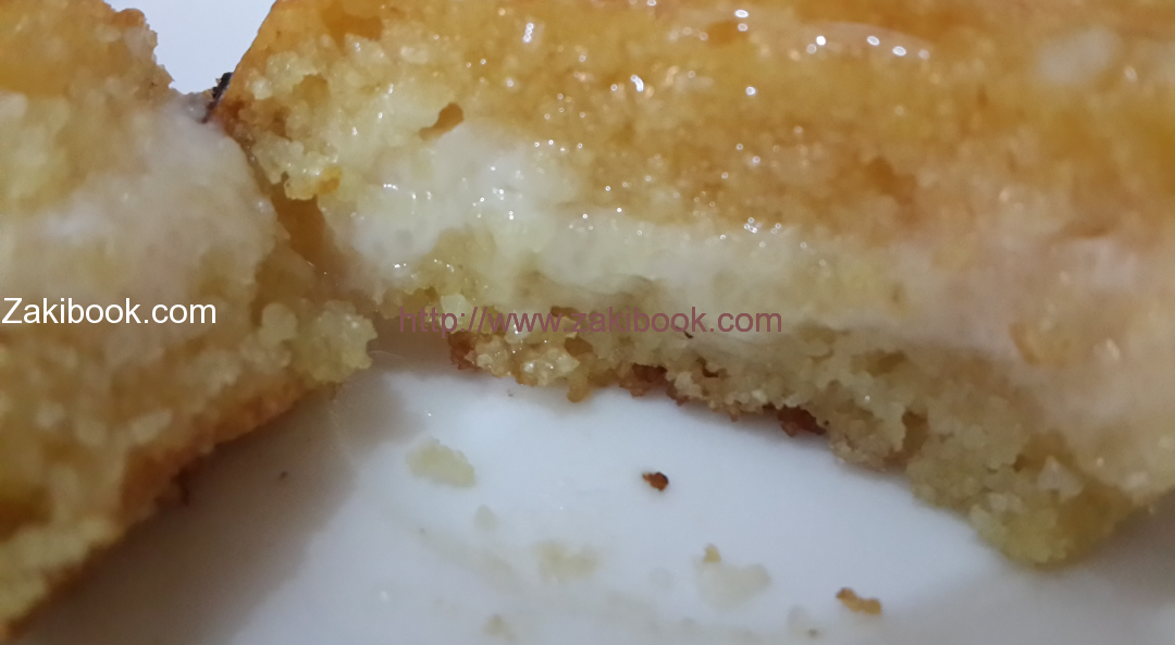 وبنضيفهم على السميد والبكنج بودر وبنقلبهم مع بعض وبنصب نص الخليط في صينيه مدهونه زيت وبنحمرها من تحت وبعدين من فوق بعدين بنطلعها وبنحط القشطه وبنحط باقي خلطة السميد وبنحمرها من فوق بس .. وبنسقيها بالقطر