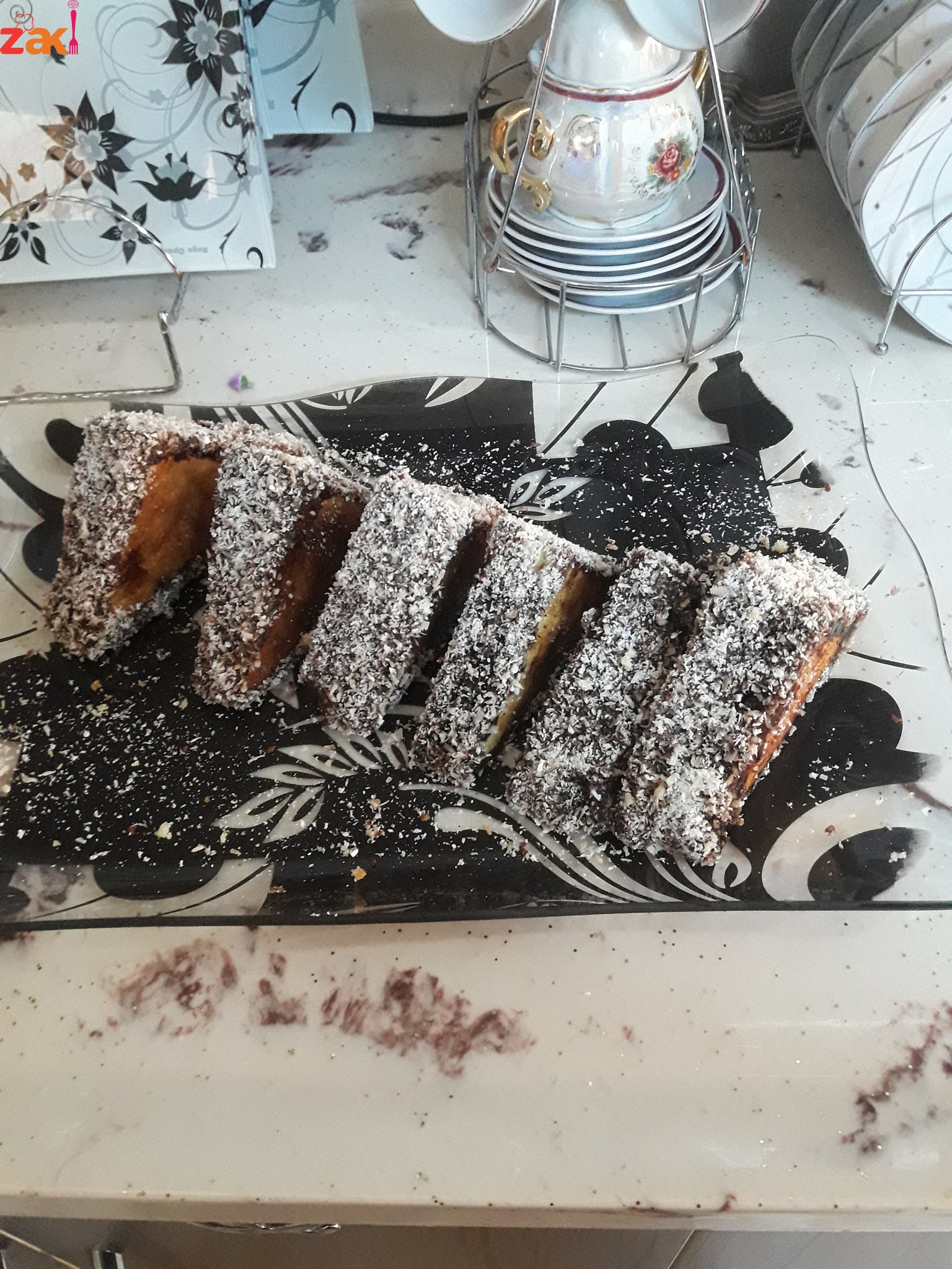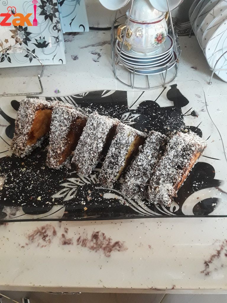 3 معالق كبيرة كاكاو ونص كوب سكر وكوب حليب وزبدة وتغلي على نار وتوضع اطرف كيك في صوص وتغطى بجوز الهند