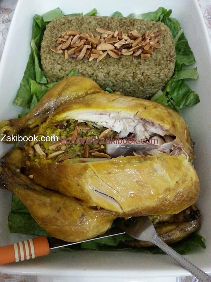 – عندما يغلي المرق ، خذي الفروج ، وصفي الفريك من المرق ،وإحشي به الفروج ، مع مراعاة ترك فراغ في الحشوة ، لأن الفريك سينفش أثناء الطبخ .