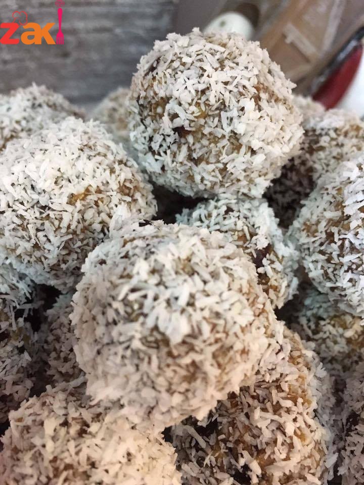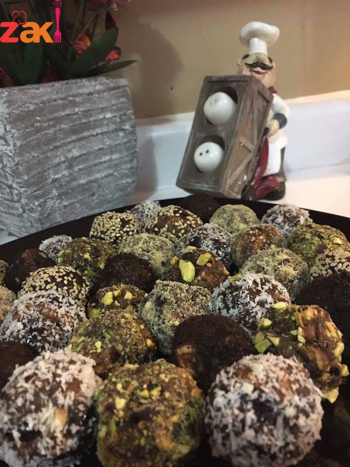 تعجن كل المكونات وتكور الى كرات التغطية سمسم محمص او اوريو مطحون او جوز هند او بسكوت سادة مطحون او فستق مطحون