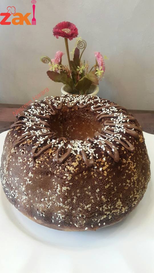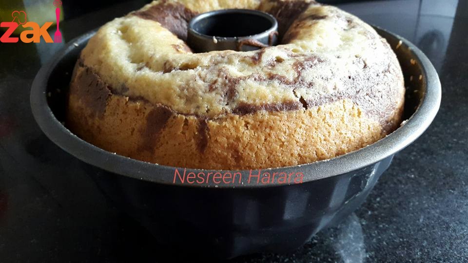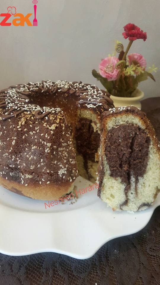 4بيض وكوب ونص سكر ونص كوب حليب سائل ونص كوب لبن زبادي ونص كوب زيت ومعلقة فانيلا ونص معلقة صغيرة برش ليمون وعصير نص ليمونة ومعلقة صغيرة خل نخلط المكونات جيدا ونضعها بصحن عميق ونضيف عليها بالتدريج 2 كوب ونص طحين منخولين مع معلقتين بيكنج بودر وربع معلقة صغيرة كربونة ونخلط بهدوء ليختفي الطحين ونصب نص الخليط بقالب مدهون طحينية ومرشوش بالسمسم الابيض وباقي الخليط نضيف عليه معلقتين كبار كاكاو بودرة ومعلقتين حليب سائل نخلطه ونوزعه فوق الخليط الابيض ونخبزها بفرن محمى عنار هادية والف صحة