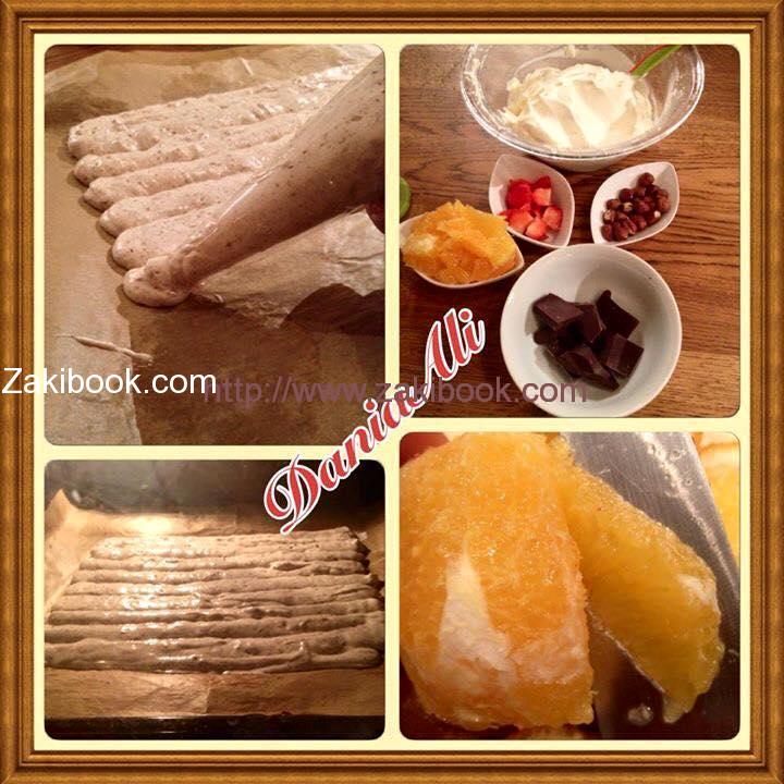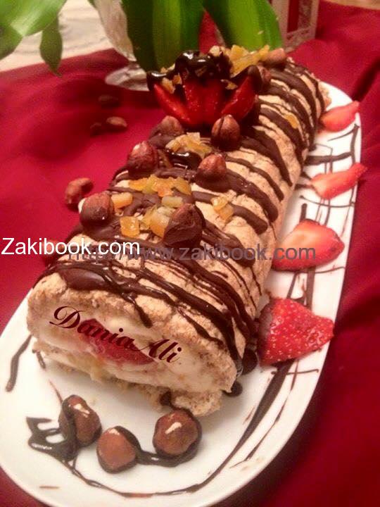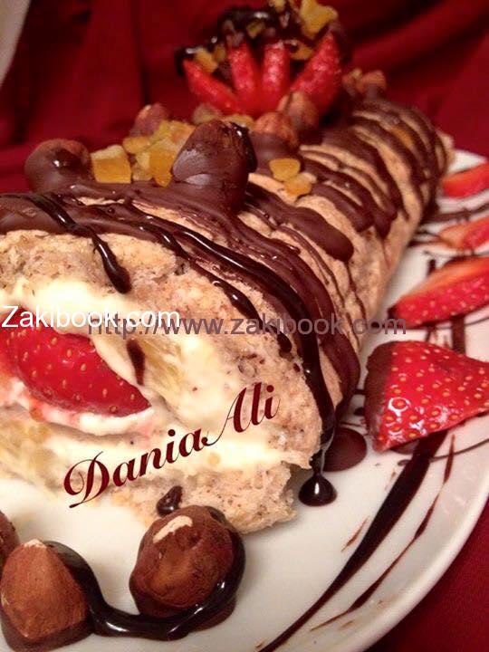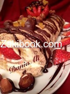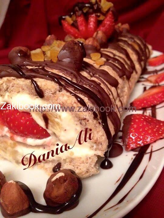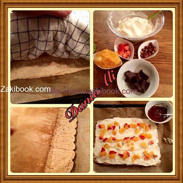 واحشيها بالكريمة المخفوقة والفواكه و لفيها وضعيها بالثلاجة لمدة ساعة حتى تبرد.