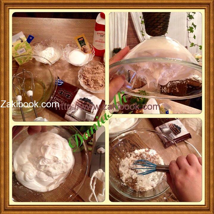 اخلطي المواد الجافة لكي لايبقى أي تكتل أضيفي المواد على خليط البياض واخلطي باليد بخفة حتى لا يهبط البياض.