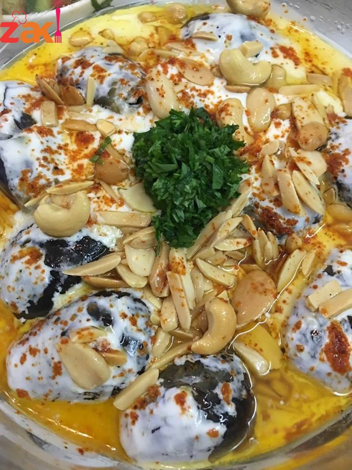 وبجاط التقديم بتحطي الخبز المقلي وتسقيه بصلصة البندورة وفوقه لبن مع توم وتصفي بانجان على وجه اللبن وتزينه بالبقدونس ومكسرات مقلية وصحة وعافية