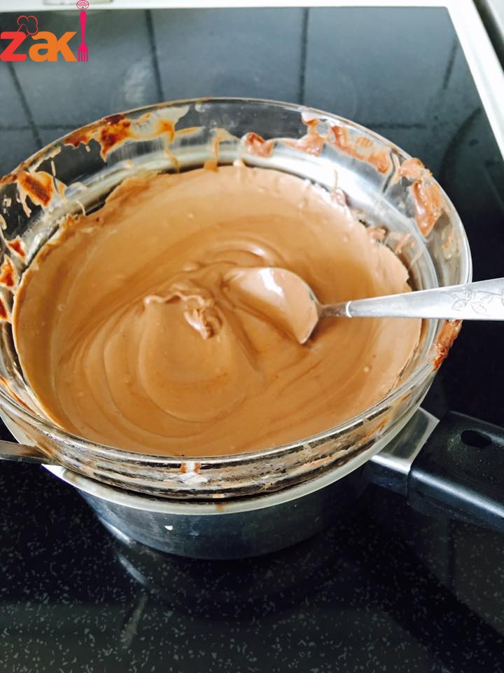 نسخن الشوكلاه على حمام بخاري ( بنحطها بطاسة زجاجية فوق طنجرة فيها ماء ونتركها تغلي لحتى تذوب كل الشوكلاه )