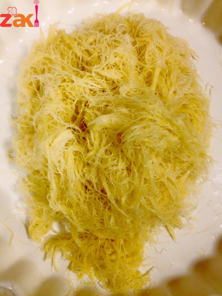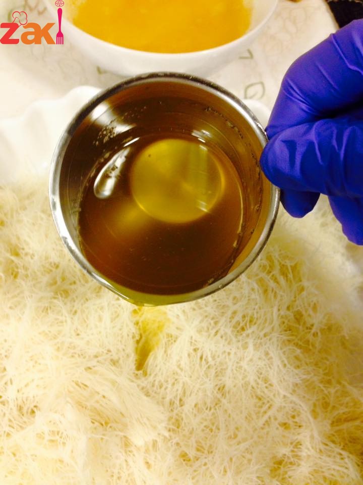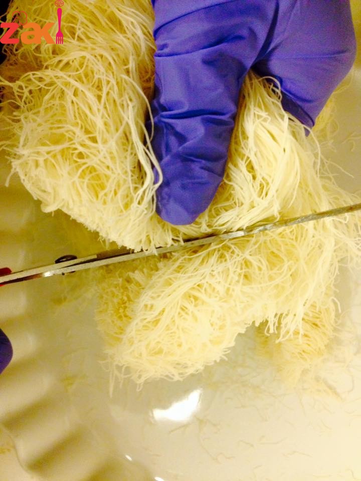 يوم التحضير قطعت عجينة الكنافة بالمقص قطع طول تقريبا ٣ سم وبعدين بحط عليها الزبدة وبفركها منيح لحتى تندمج مع العجينة