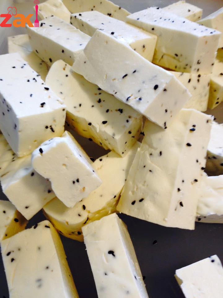 بعد مانشف الماء تماما من الجبنة مدة ٦ ساعات تقريبا او اكتر نشيلها من الكيس ونقطعها على حسب مابدكم