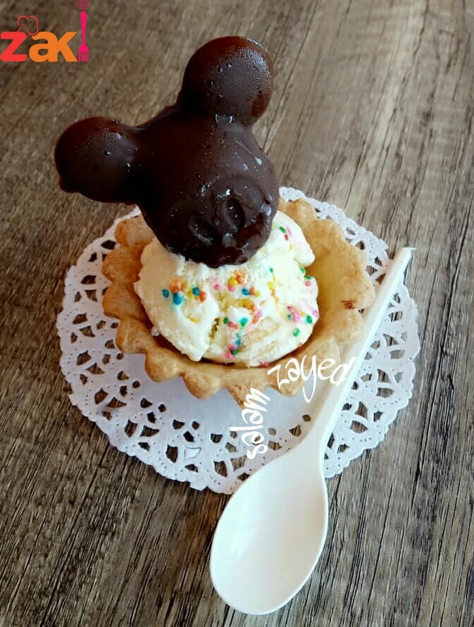 وبدخلها عفرن محمى مسبقا عدرجة حرارة 180 لما تتحمر الاطراف بفرغ الحبوب من التارت وبكمل خبزها وتاخد اللون الدهبي بتركها تبرد تماما ..وانا زينتها بالنوتيلا وحبوب السكر الملونة واللوز المحمص والمارشميلو .. والحجم الكبير عملت القاعدة سميكة عشان الايسكريم وصحتين وهنا