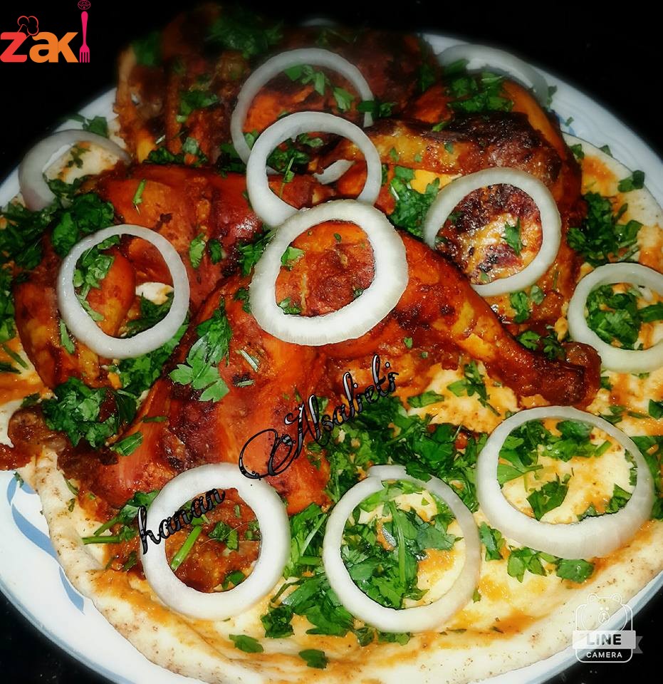 في صينية تانيه مندهنها زيت ومنحط رغيف الخبز ومندهنه بالخلطه الي شلنها ومنحطه 3 دقائق بالفرن ومنخرج الصينيه من الفرن ومنرتبهم في صحن التقديم منحط اول شي رغيف الخبز وبعدين الدجاج مع الصلصة ومنزينه بالبصل والبقدونس ومنحط فحمه ومنغطيهم لحتى يوخد الطعم
