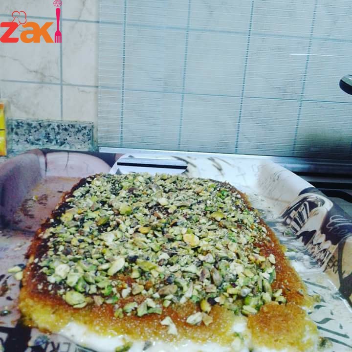 ونطلعها ونعمل بالسكين عالحواف ونقلبها بحذر على صينية اكبر وممكن تعمليها بصينية مدورة حسب الزوق ونزينها بتلفستق الحلبي وبعدين تشربها بالقطر ،،،،وكلي وتهني خفيفة وطييية ووووصحة وعافية