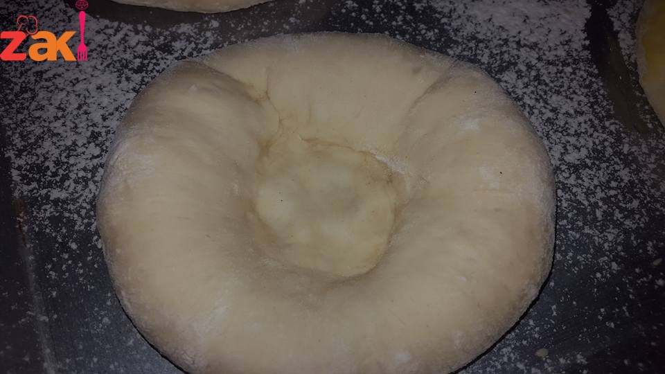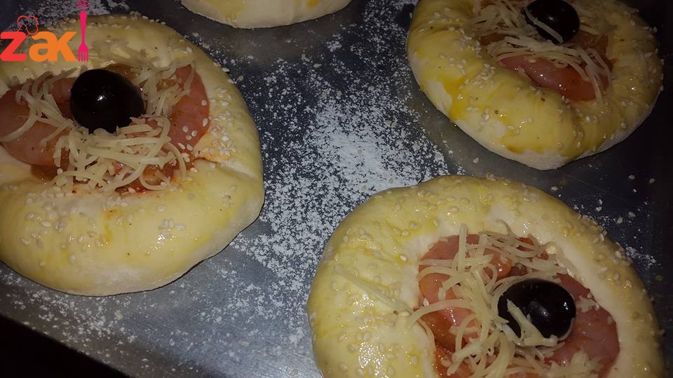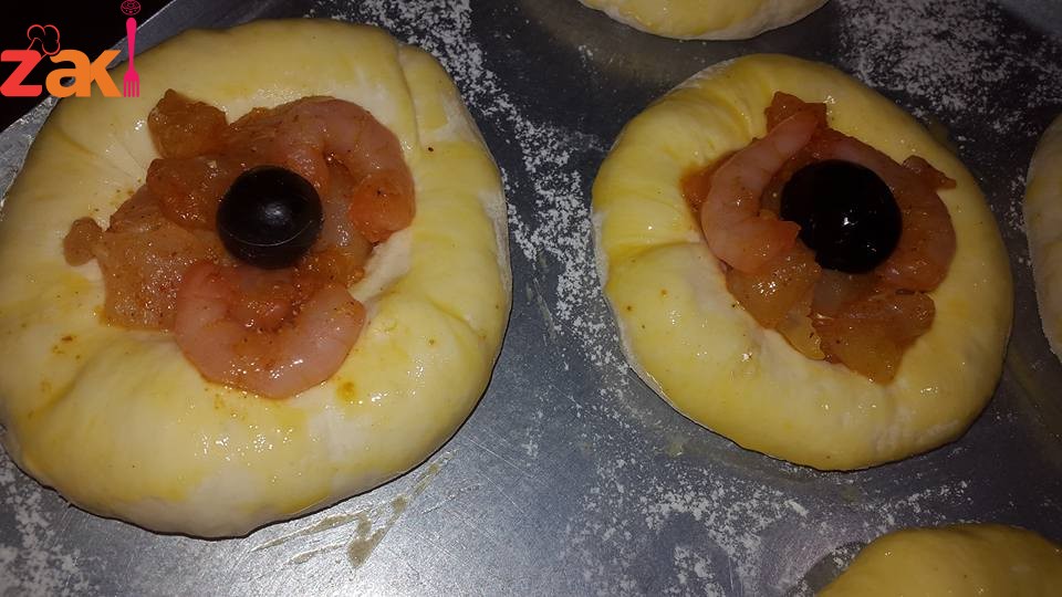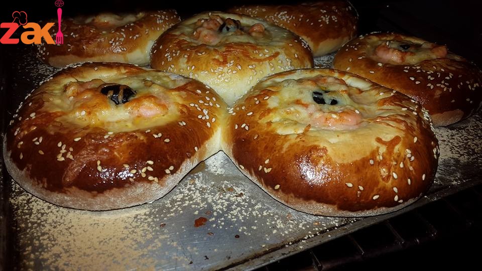 2 كاسات مي دافيه و 2 كاسات طحين و 2 ملاعق خميرة خبز و 2 ملاعق سكر تخلطيهم منيح و تخليهم يخمرو بعدين ضيفي 3 كاسات طحين و نص كأس زيت و 3 ملاعق كبيره حليب بودره و ملعقه صغيره بيكنج باودر تعجنيهم منيح و تشكلي متل مبين بالصورة و الحشو لي من برا سمك صول مقطع و عليه بهارات و جمبري كمان و حبه زيتون و رشه جبن شيدر و عالفرن و صحه و هنا بصراحه شي ناهي