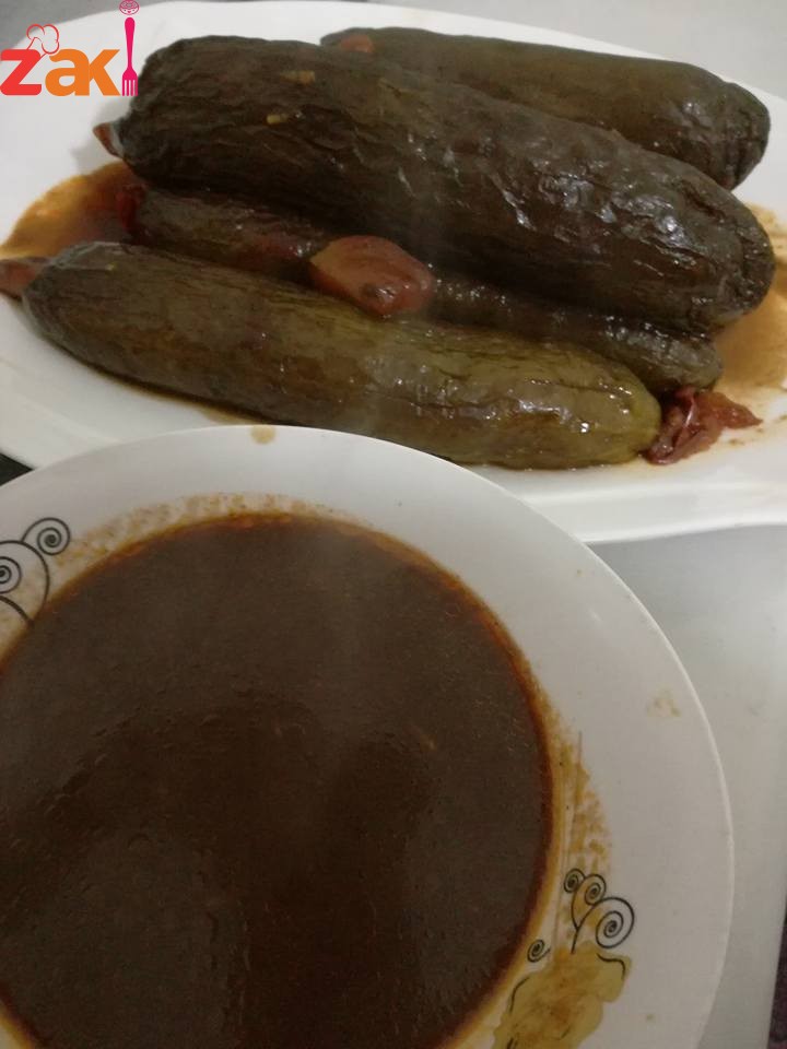 و بعدين بتكوني غاليه او ناقعه تمر هندي و بتمرسيه و بتحطيه على الخيار مع 4 ملاعق بندوره و ملعقين كبار دبس رمان و بعد ساعه من الغليان بتدقي ثوم و بتحطيها بالطنجره فوقهم حتى تعطيه نكهه و بتخليه يغلي لغايه لما يستوي و بتسبكي الصلصه