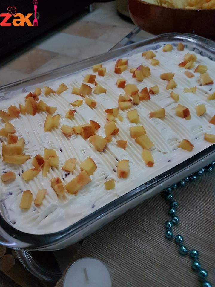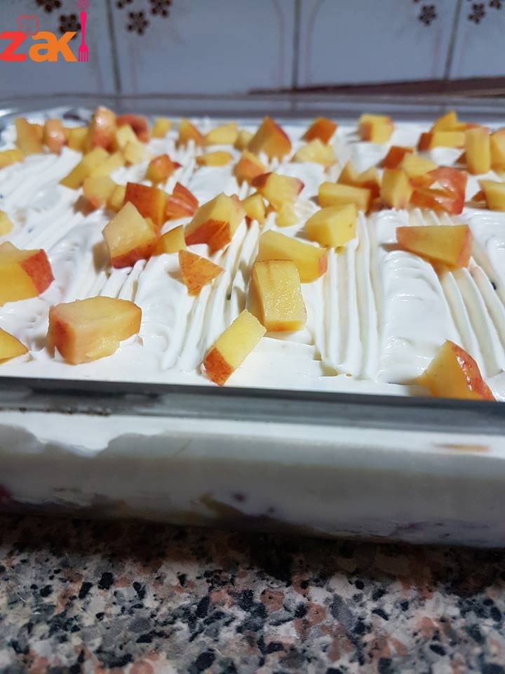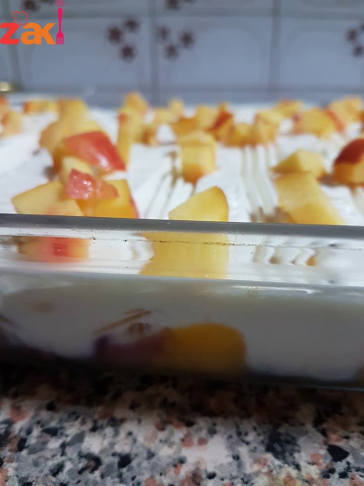 اول شي بتصفي بسكوت طبقه بقاع صينيه بايركس او اي صينيه بتحبي بعدين بتحطي علبه الفواكه المشكله مع ميتها على البسكوت وكمان الفواكه اللي عندك وبتحبي تحطيها وبتخفقي الكريمه مع الحليب لحتى تتكاثف وبضيفي علبه القشطه وبتحركي الخليط وبتحطي فوق الفواكه وبعدين بتحطي بالبراد ليله وبعدين بتزينيها بالفواكه اللي بتحبيها وصحه وهنا