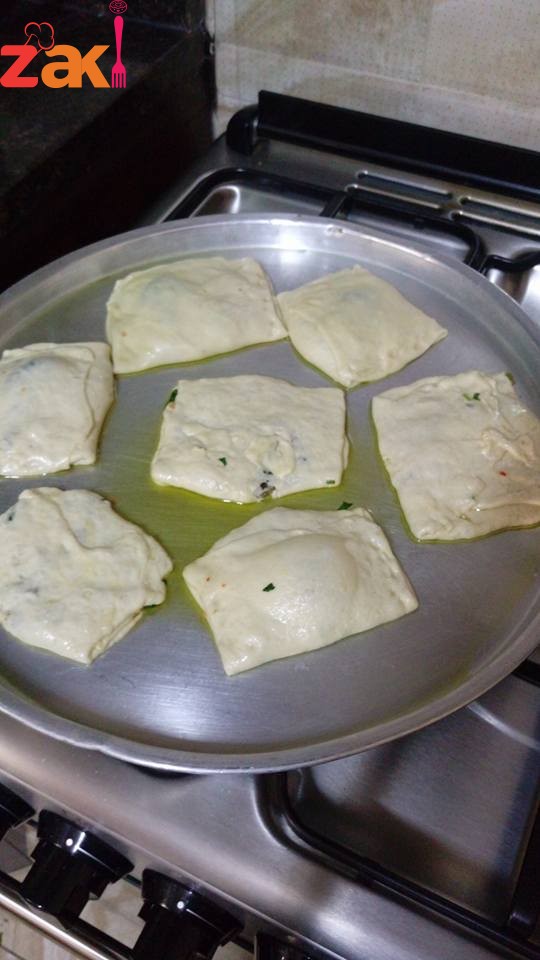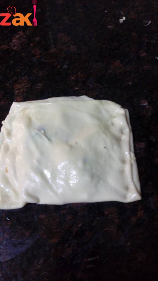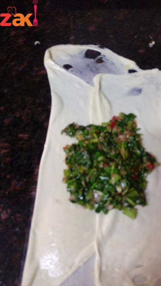 بعدين قطعت العجين كرات متوسطة ورقيتهم بمرقة العجين لحتى صارت العجينة شفافة دهنتها زيت ثنيت طرفين العجينة للوسط كما هو بالصورة حطيت معلقتين من حشوة السبانخ ورديت الاطراف التانية فوق بعض متل المطبق لحتى يصير عنا مربع وبنصفهم في صينية مدهونة بزيت زيتون وخليكي كريمة شوية بالزيت