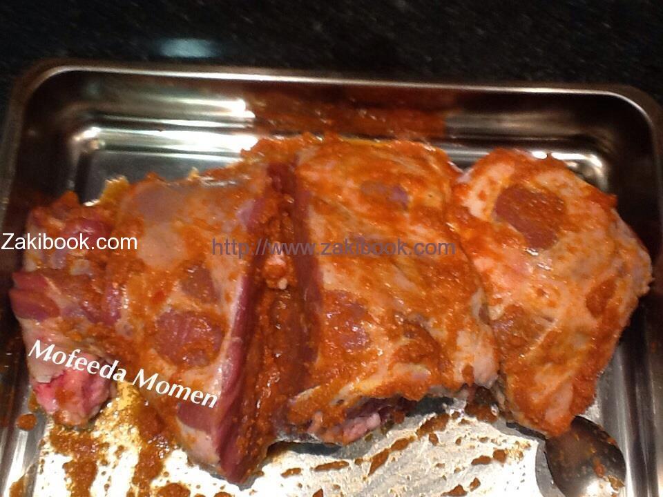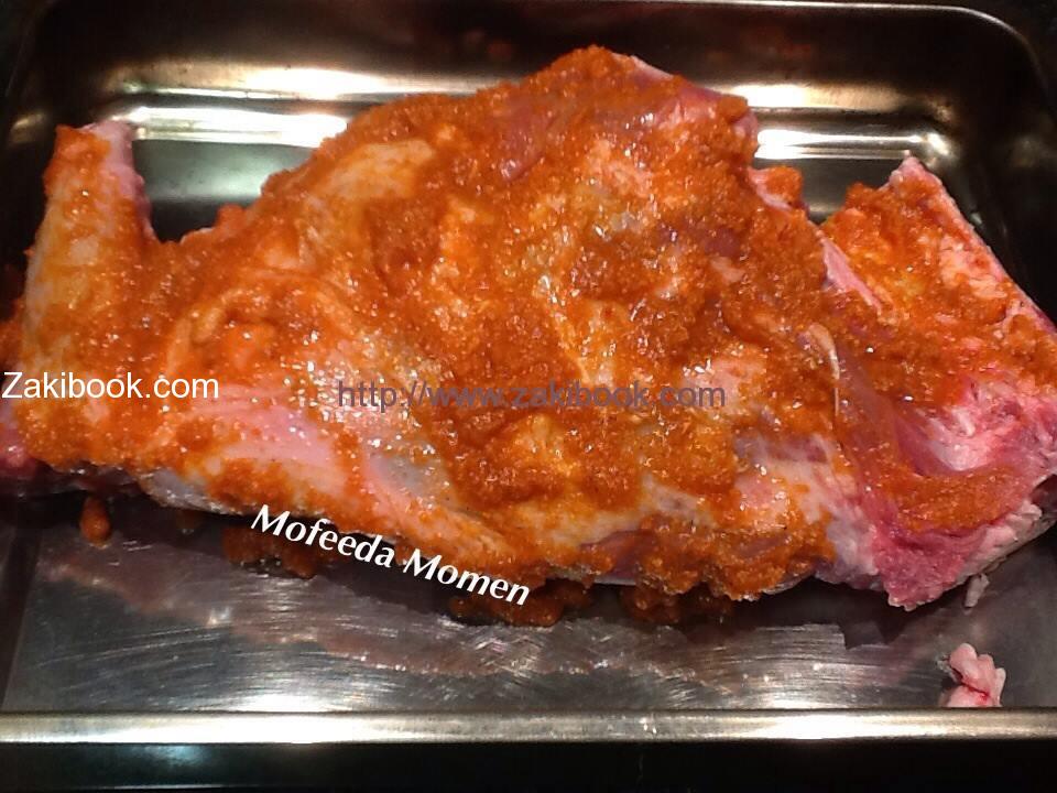 – تضرب التتبيلة في الخلاط حتي تنعم تماماً نعمل شقوق في اللحم ونتبل اللحم بهذه الخلطة وتترك ليلة كاملة في البراد.