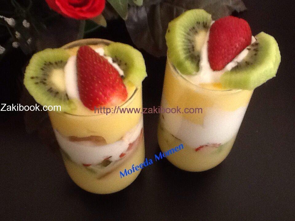 – اجهز الفاكه هو أقطعها واضرب الكريم شانتيه وبعد مايبرد أضيف الفاكهه وكمية من الكريم شانتيه ويترك يبرد ثم تضاف الكمية الباقية من الكاسترد وتجمل بالفاكهة وبالنهاية والشفا#مفيدة#.
