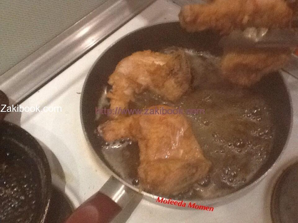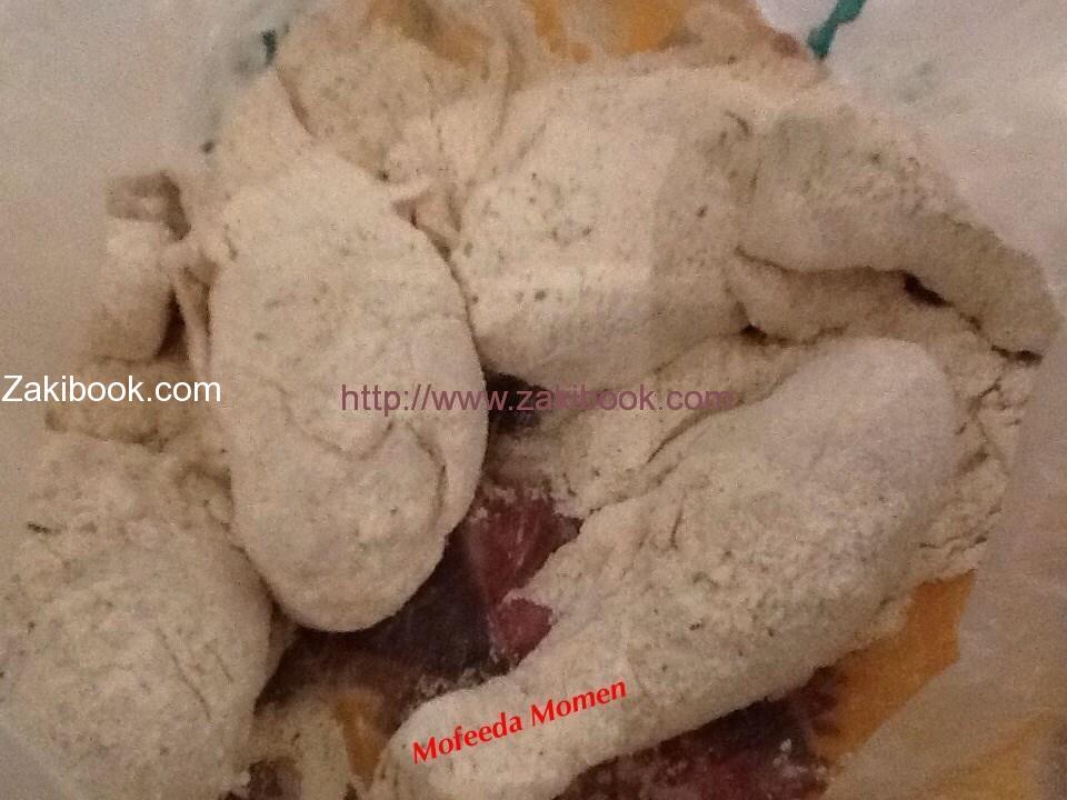 تتبلي الدجاج في خليط الدقيق كويس وتضغطها عليه قوي وتحت الجلد وتسبيها في الدقيق شوية.