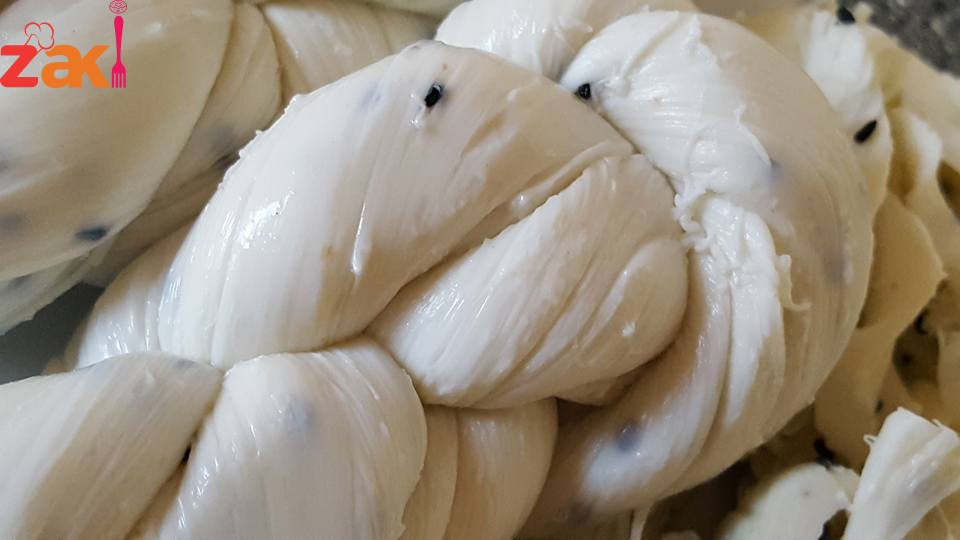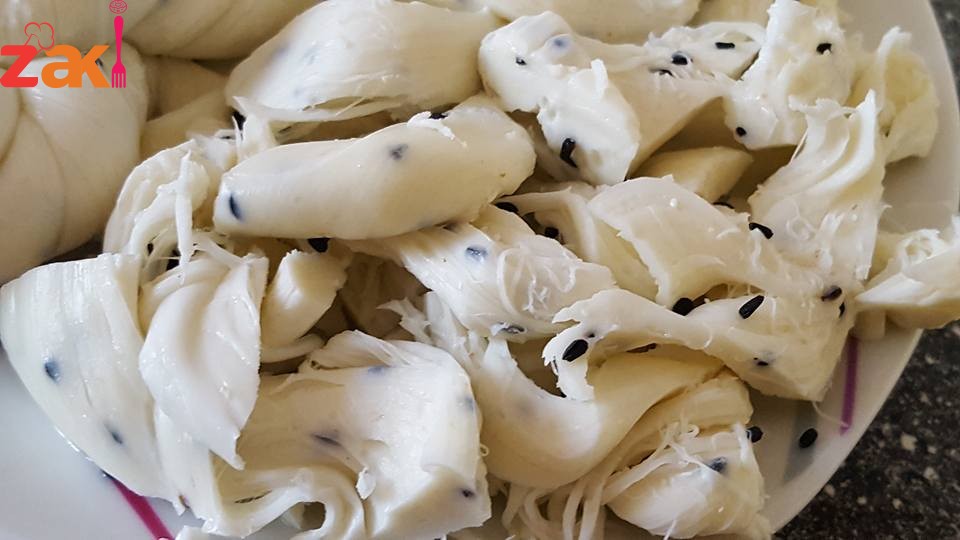 جببنة موتزريلا تضعيها بالقلاية ملح الحبة السوداء ومحلب بتظلي تحركي فيها لما تنزل كل الماء الي فيها ثم تشكليها مثل ما هو مبين في الفيديو