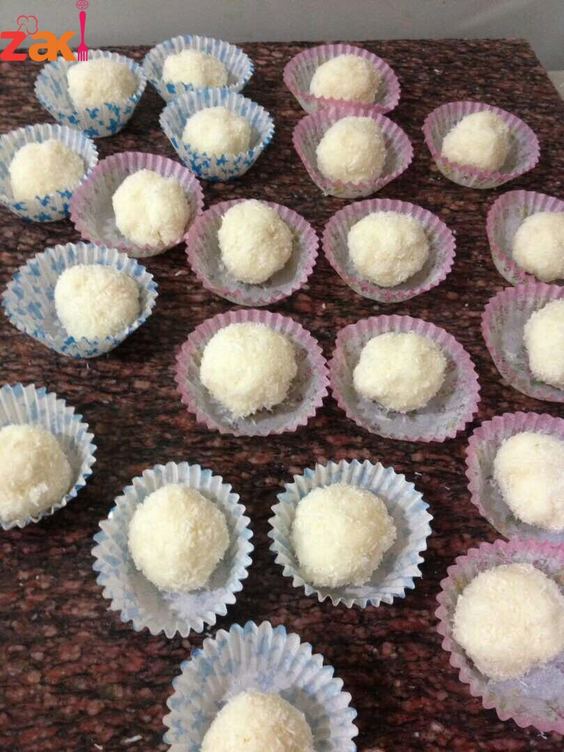 1. نشيل شوي من الجوز الهند في جاط ونخلط الباقي مع علبة الحليب المحلى المكثف والفانيلا وتعجن مليح حتى يصير عندي عجينة