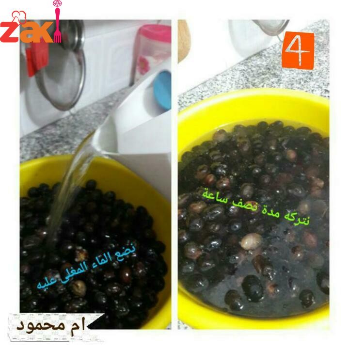 ونتركه مدة من 3 أيام إلى أسبوع ونلاحظ نزول الماء من الزيتون.