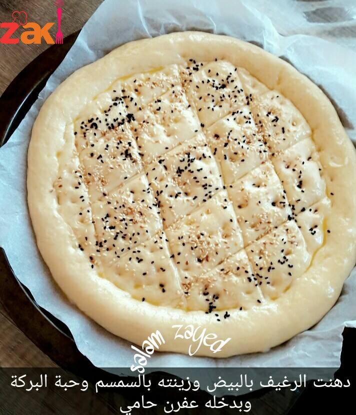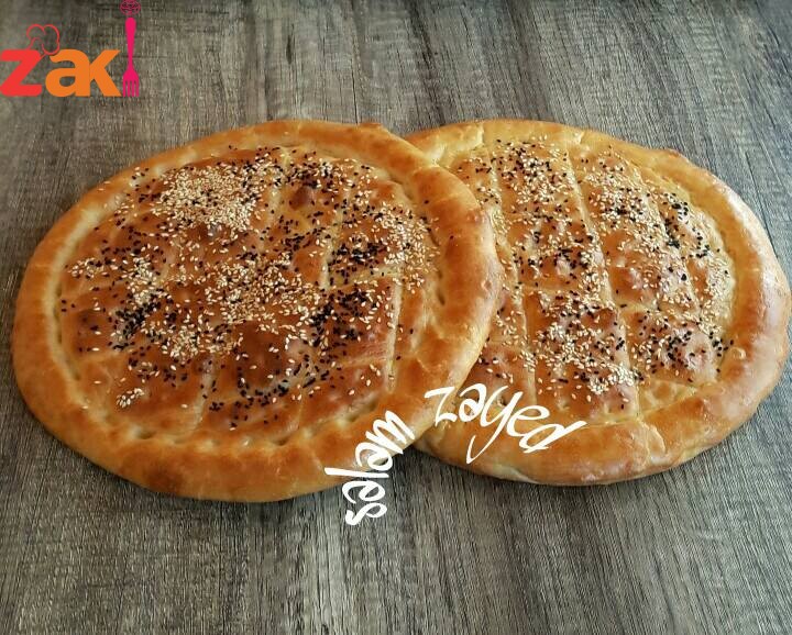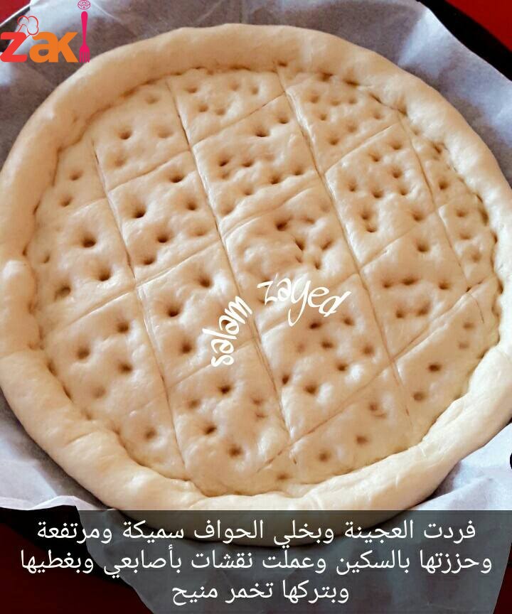 بعدين باخد العجين بقسمها لجزئين وبكور كل جزء وبتركه يرتاح ربع ساعة وبعدين بفرد كل رغيف بصينية مبطنة بورق الزبدة وما برفع سمك الرغيف وبعطيه شكل الخطوط المائلة بقطاعة البيتزا وبغطيهم ليختمروا منيح ويتضاعف حجمهم بعدين بدهن الوجه بيض وبزينه وبخبزهم بفرن محمى مسبقا عدرجة حرارة 200 عالوجهين بغطيه اول ما يخلص عشان يحافظ عطراوته ويقدم .. وصحتين وهنا