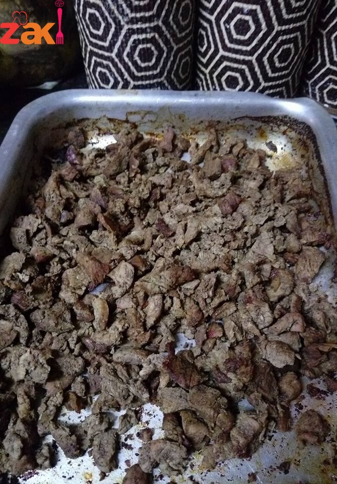 نغسل اللحمة جيدا من ماء النقع ونضعها في صينية ونضيف لها الملح وجميع البهارات المذكورة ومعلقتين زيت ذرة