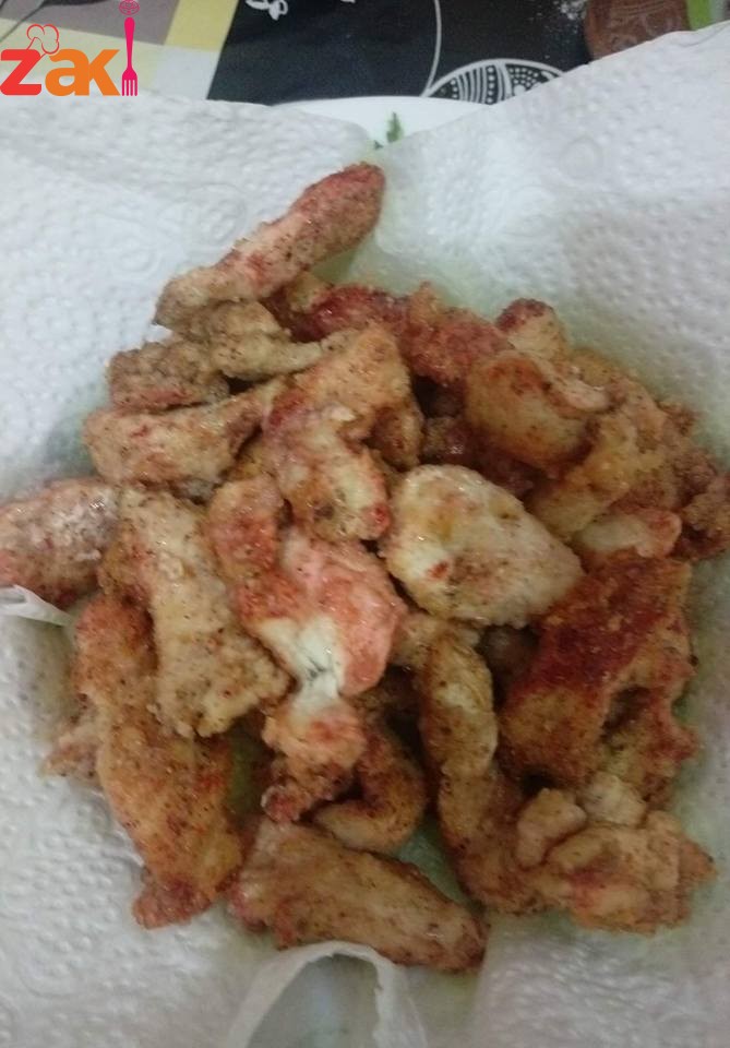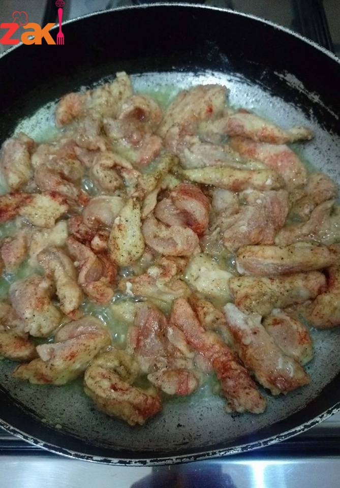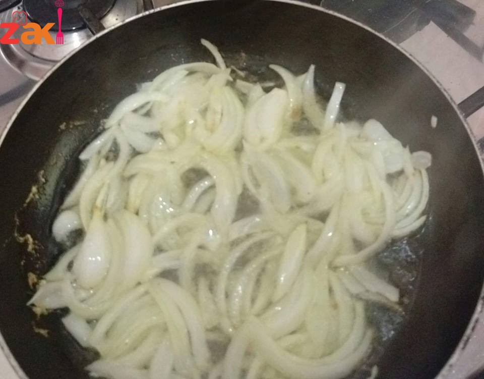 يقطع الدجاج الى شرائح ثم يتبل بالبهارات ثم يوضع في مقلاة على نار هادئة ويقلببالزيت حتى يصبح لونه اشقر . ويترك على نار هادئة الى ان ينضج يرفع ويوضع على ورق المطبخ …في نفس الزيت يضاف البصل و يقلبوا جيداً حتى تذبل شرائح البصل.