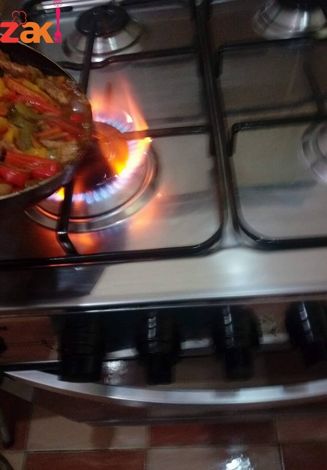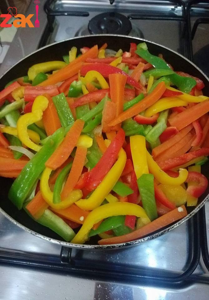 يضاف الجزر والفليفلة ثم يتبلوا ، بالهال، البهارات المشكلة والملح، يحركوا جيداً ويقلبوا لمدة دقيقة ثم يضاف اليهم شرائح الدجاج و الطماطم يحركوا ويتركوا على النار لمدة دقيقتين.