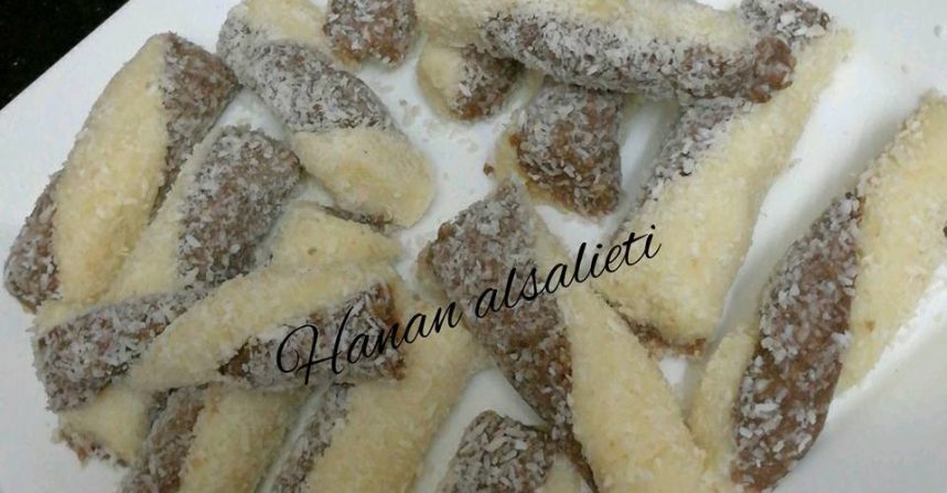 منعمل من كل خليط دائرتان ومنمدهم بشكل طولي على الرخام او على اي شي بعد ما اندهنه بشويت زيت زي الي بالصوره ومنثبت الطرف الاول مع بعضه ومنبلش انجدلها ومنثبتها من الطرف التاني ومندحرجها بجوز الهند ومنقطعها بالسكين بالحجم الي منحبه ومنحطهم في البراد ليتماسكوا لمدة ساعتين…