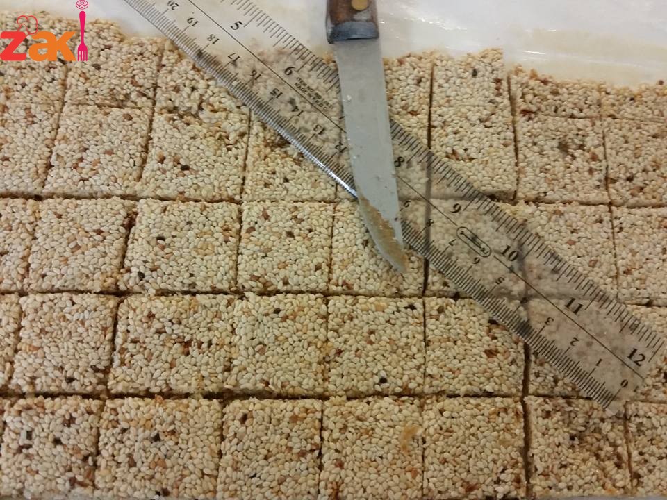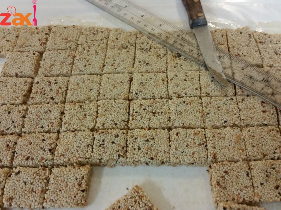 يوضع السكر والعسل عالنار ويحرك باستمرار حتى يغلي … يوضع السمسم المحمص وهم عالغاز ولمدة دقيقتين .. يفرد على ورق زبدة مدهونة زيت وطحينية ويفرد ويقطع