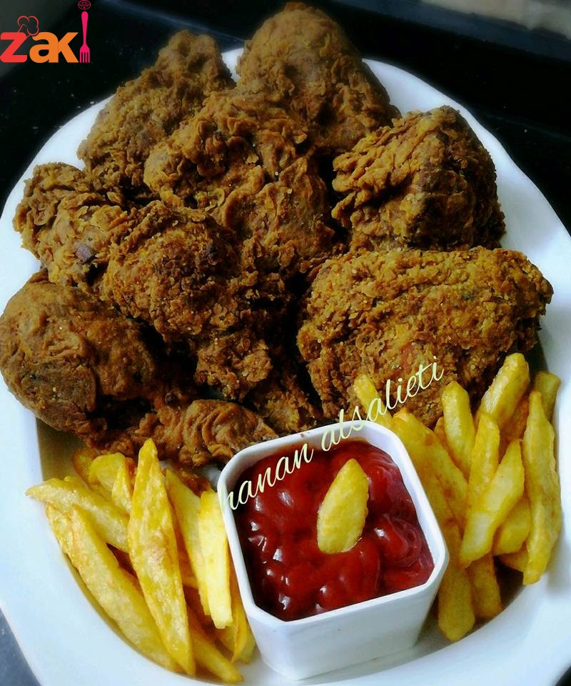 ومنبلش نقلي اول شي منحط الدجاج بالطحين ومنرجع انحطه بالخليط الي تبلنا فيه الدجاج ومنرجع انحطه بالطحين مره تانيه وهكذا لنخلص الكميه كلها ومنقليهم في زيت غزير وحامي اول شي على نار عاليه وبعدين على الوسط ليستوي الدجاج من الداخل ويقدم معه البطاطا والكاتشب.