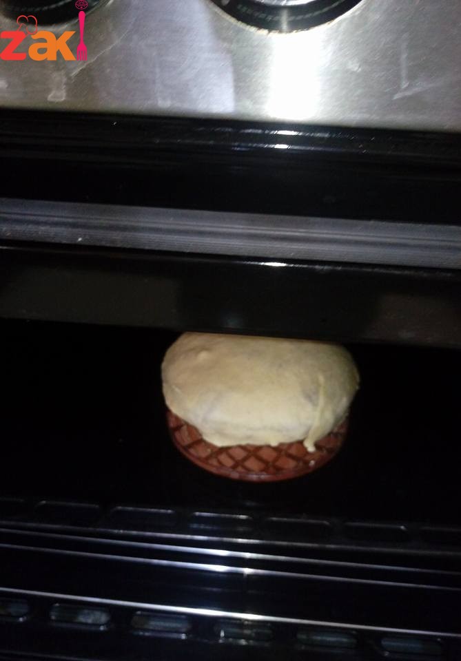 بالفخارة بحط اللحمة المقلبة والخضار والباذنجان وبسكب فوقهم مقدار كاسة مي مغلية، وبرق العجينة وبغطي الفخارة فيها وبحطها بالفرن لمدة ساعة وبعدين بحطها تحت الشواية لحتى تحمر العجينة شوية وممكن تحمر بالفرن بدون شواية