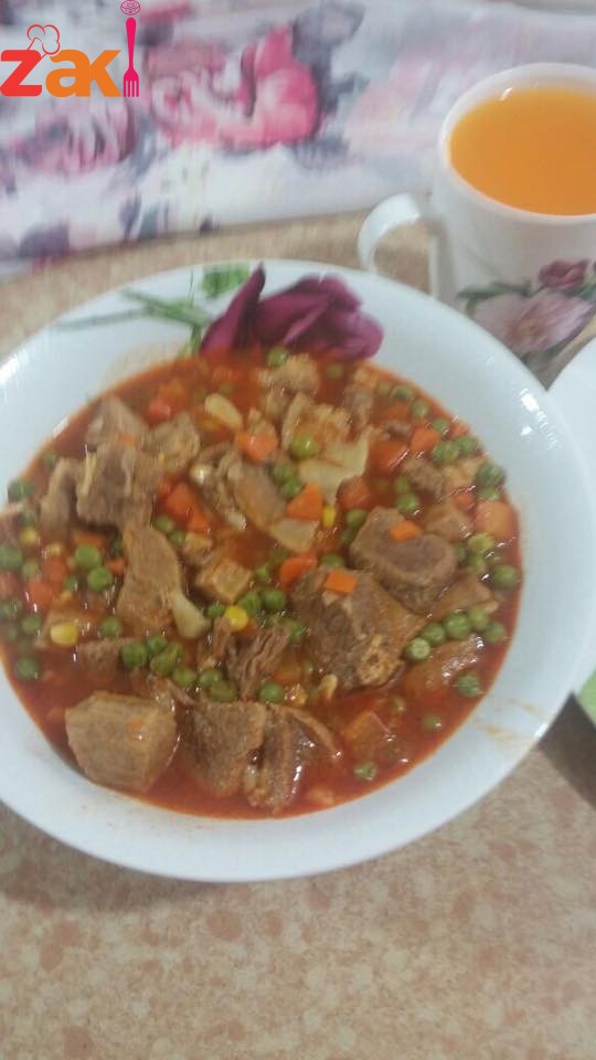 بعد ان يستوي اللحم نضيف البزيلا والجزر المقطع ونتركه يغلي ثم نضيف صلصة البندوره ونتركه يغلي جيدا