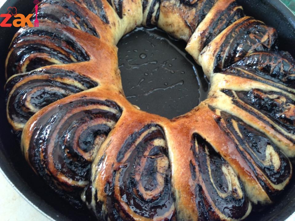 تترك حتى ترتاح قدر ساعه ثم تقطع كرات كبيره وتفرد كل واحده وتدهن بخليط الكاكاو وتقطع مثل البتزا ونلف كل مثلث وتوضع في صينية الخبيز وتترك اقل شي ساعه الى ساعتين بتكون هشه اكثر