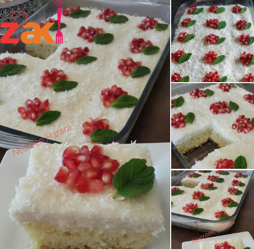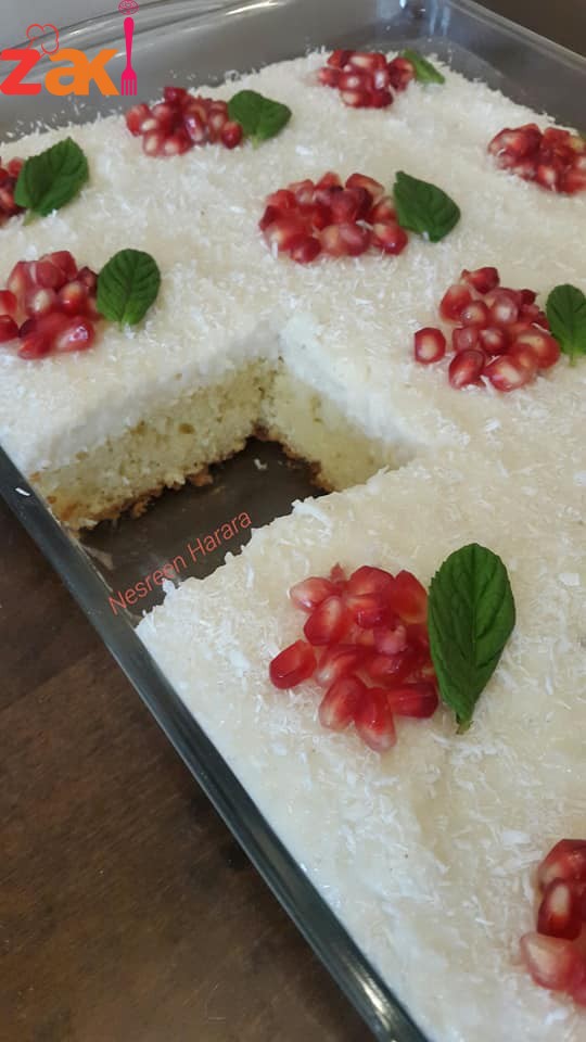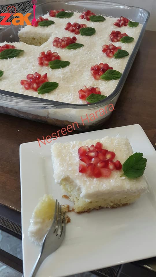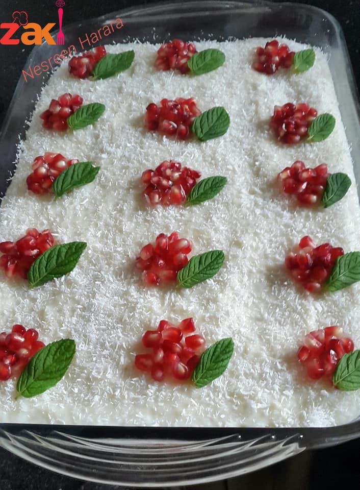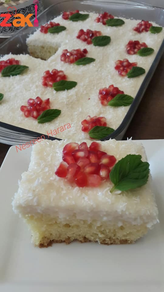 ونصب الخليط فوق الكيك ونرش الوجه جوز هند وتزين بفستق