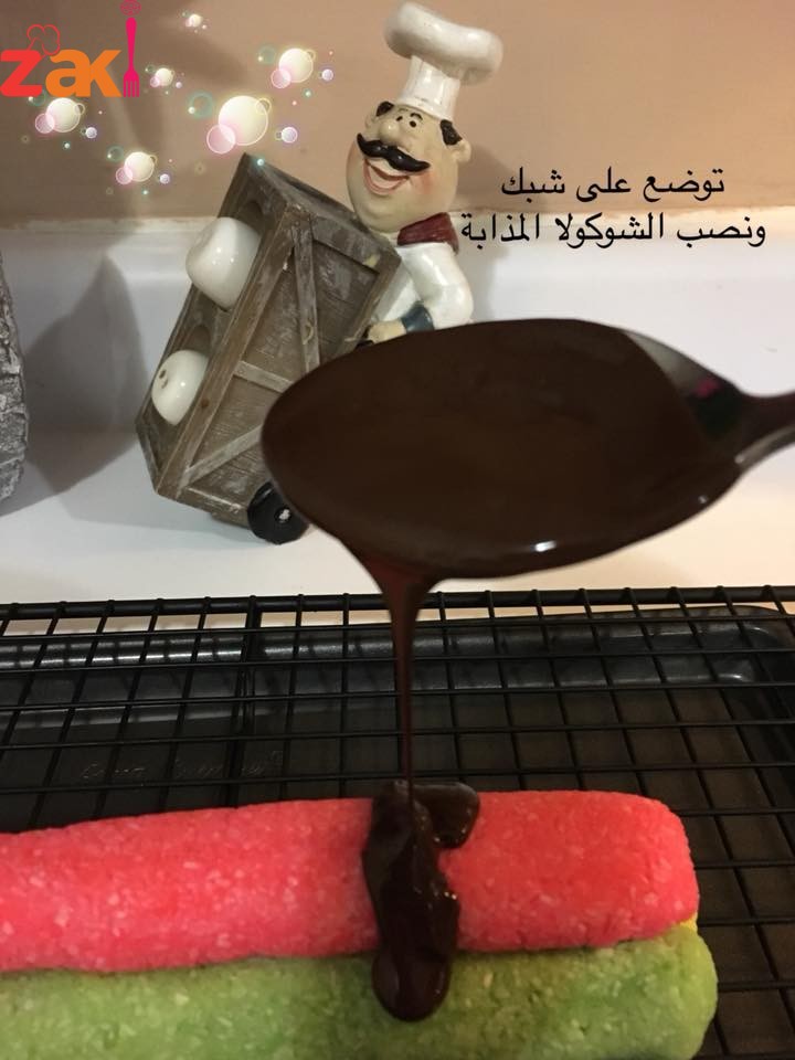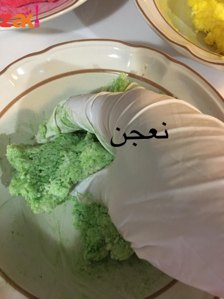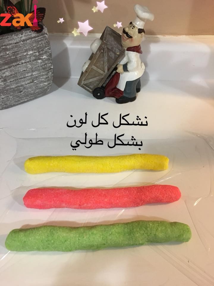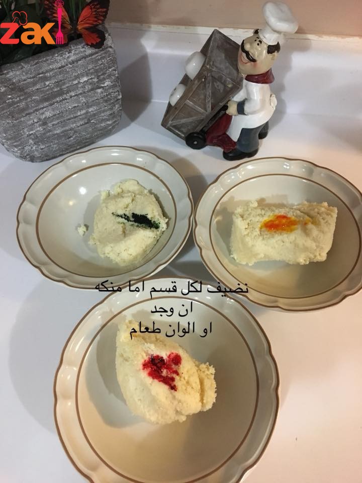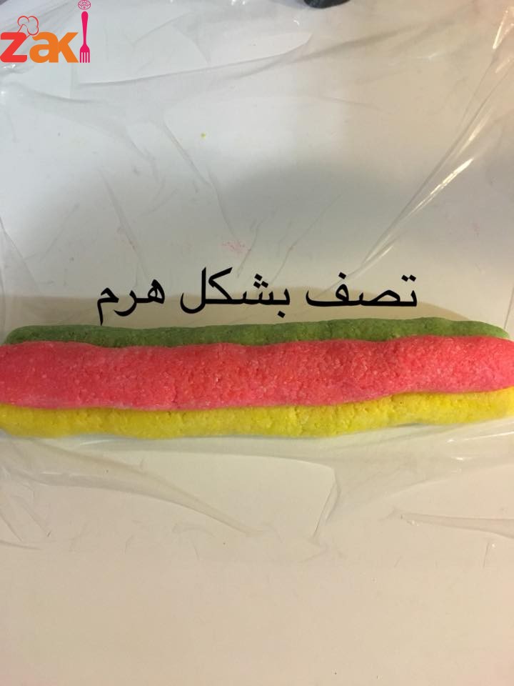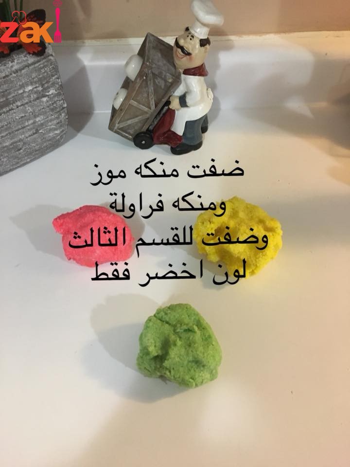 بعد تشكل العجينة نقوم نقسمها الى ٣ أقسام نضع بكل قسم منكه مثل الفراولة او الموز او اليمون او نكهة الفستق ونعجن كل قسم على حدا ثم نشكل كل قسم على شكل طولي ونضعهم فوق بعض على شكل هرم وتلف ببلاستك غذائي وتدخل الفريزة (المجمدة) ساعة